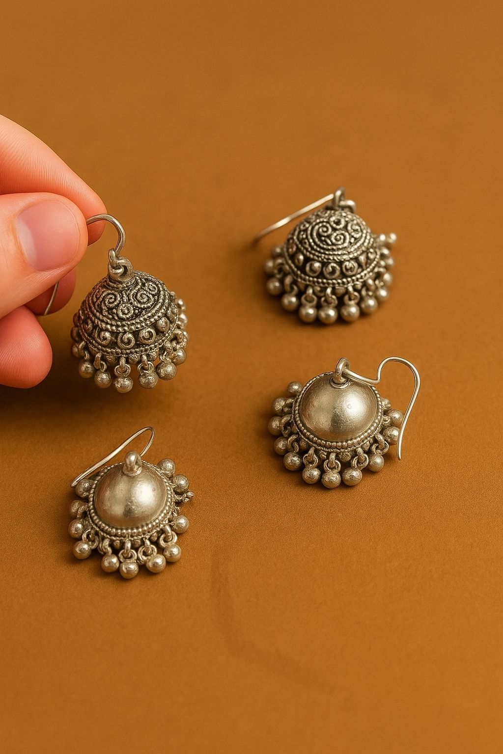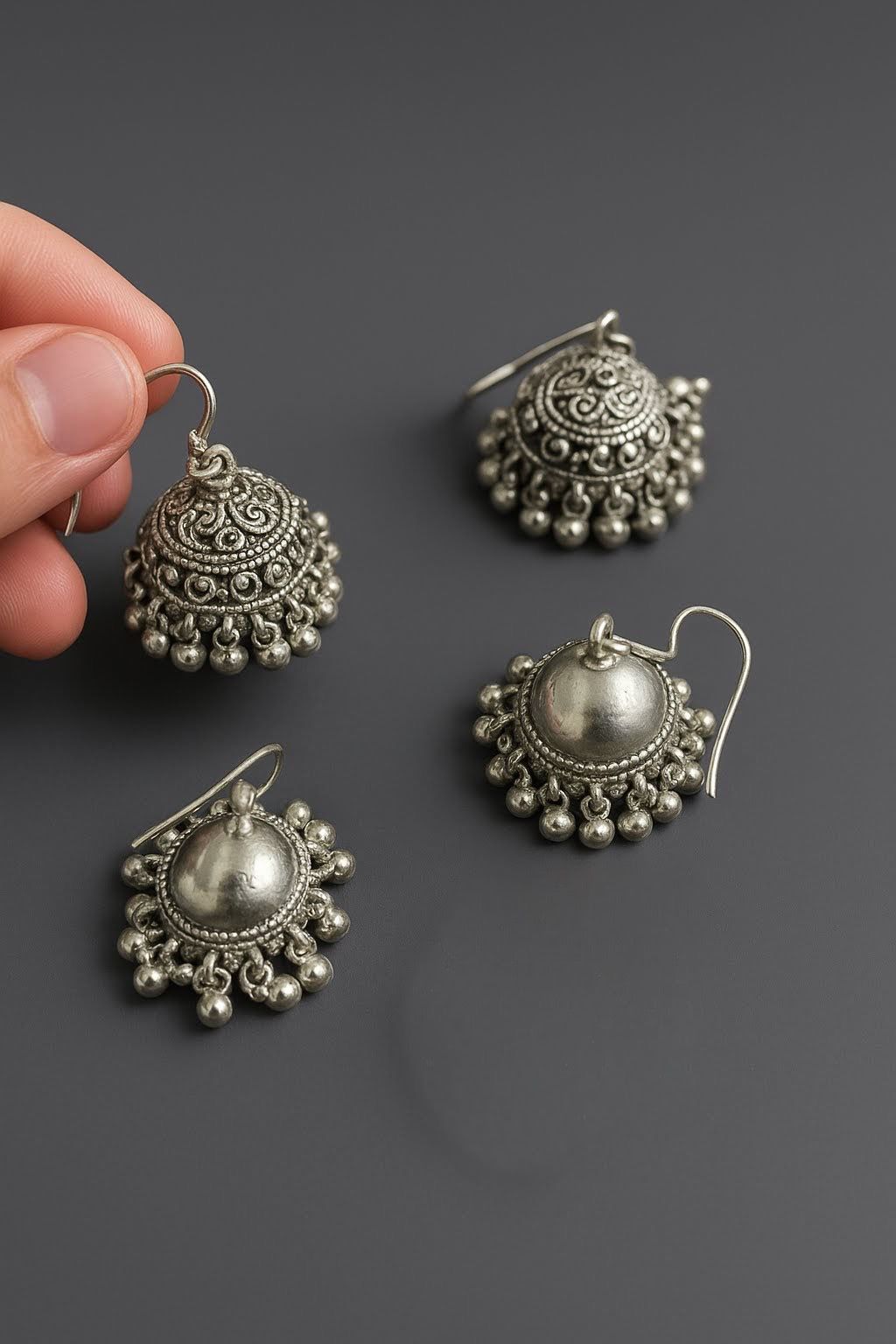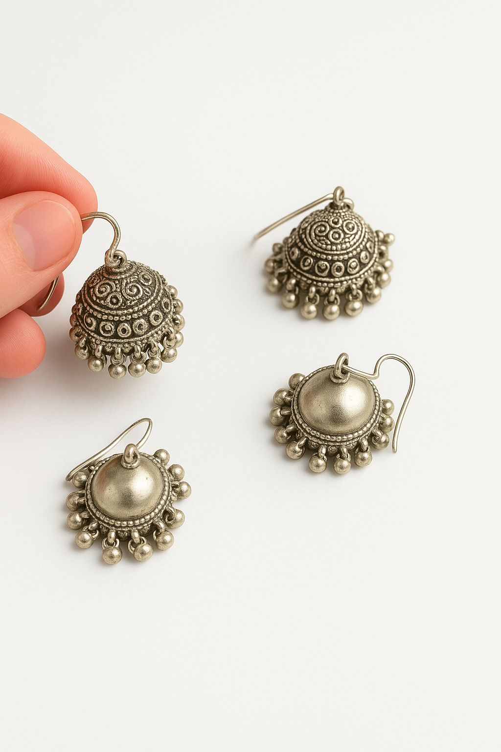 Add a touch of traditional elegance to your look with these beautifully crafted oxidised silver earrings. Made from premium alloy metal, these earrings feature a timeless design that pairs perfectly with both ethnic and casual outfits. Their antique finish gives them a rustic charm, making them a must-have in your jewellery collection.