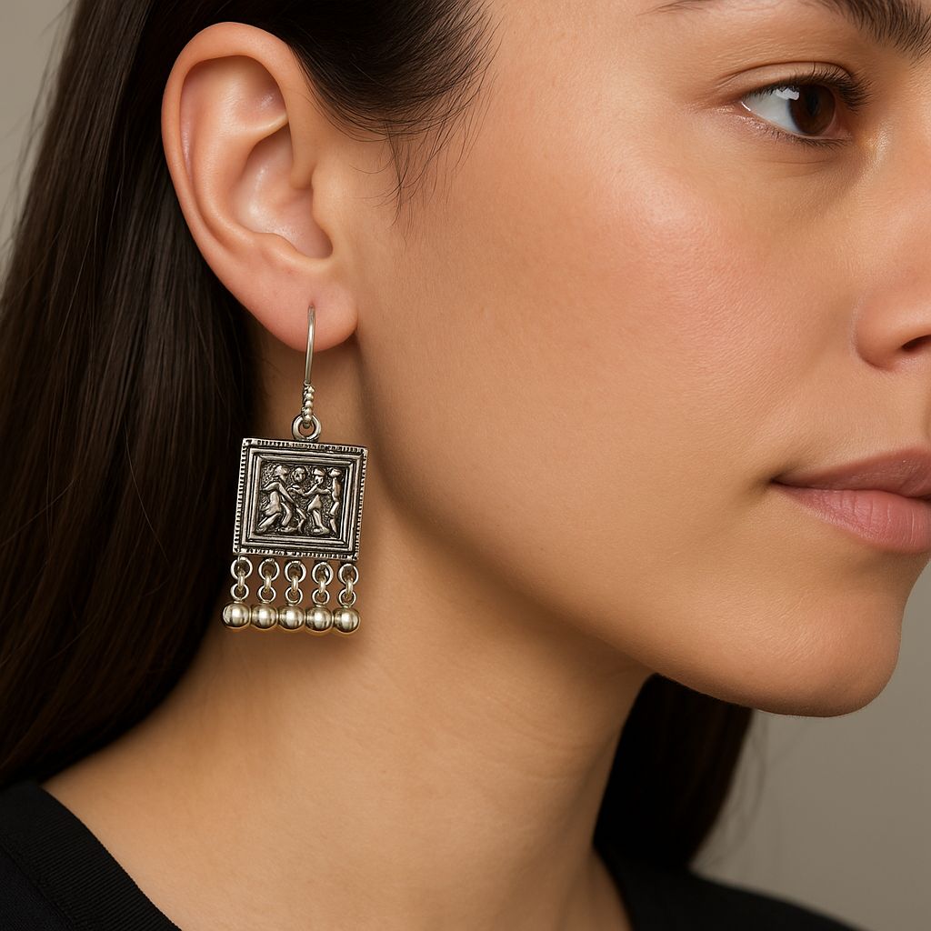 Add a touch of traditional elegance to your look with these beautifully crafted oxidised silver earrings. Made from premium alloy metal, these earrings feature a timeless design that pairs perfectly with both ethnic and casual outfits. Their antique finish gives them a rustic charm, making them a must-have in your jewellery collection.